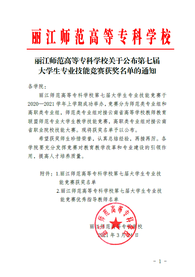 丽江师范高等专科学校关于公布第七届大学生专业技能竞赛获奖名单的通知