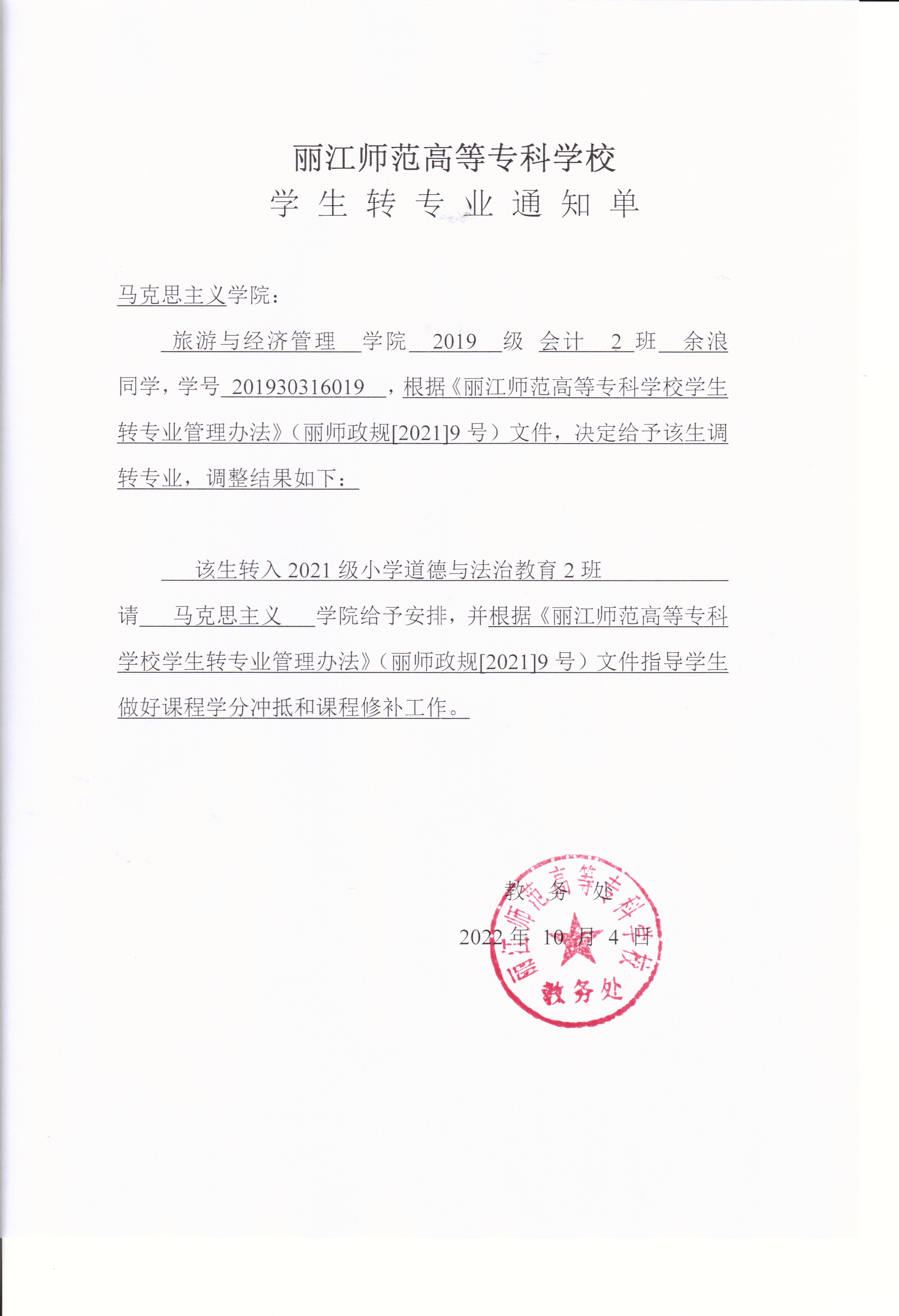 丽江师范高等专科学校余浪同学转专业通知单