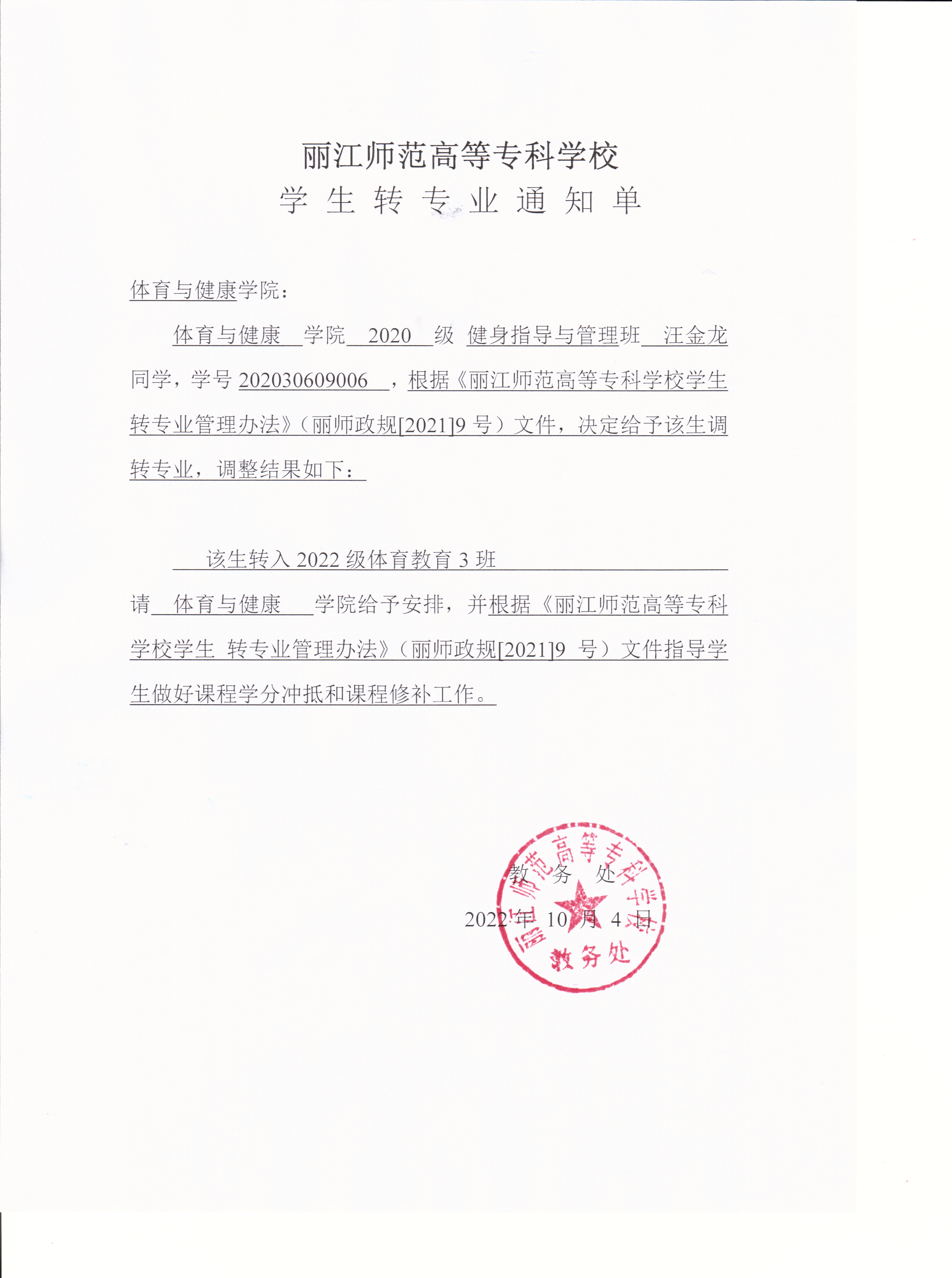 丽江师范高等专科学校汪金龙同学转专业通知单