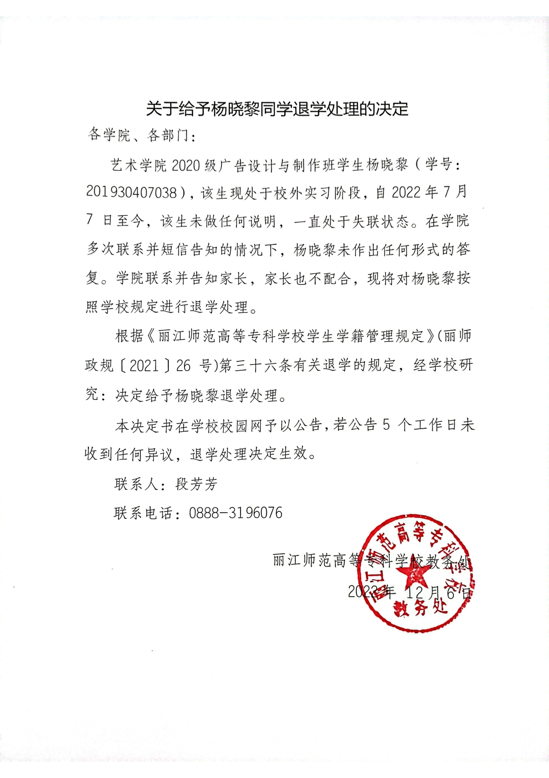 关于给予杨晓黎同学退学处理的决定