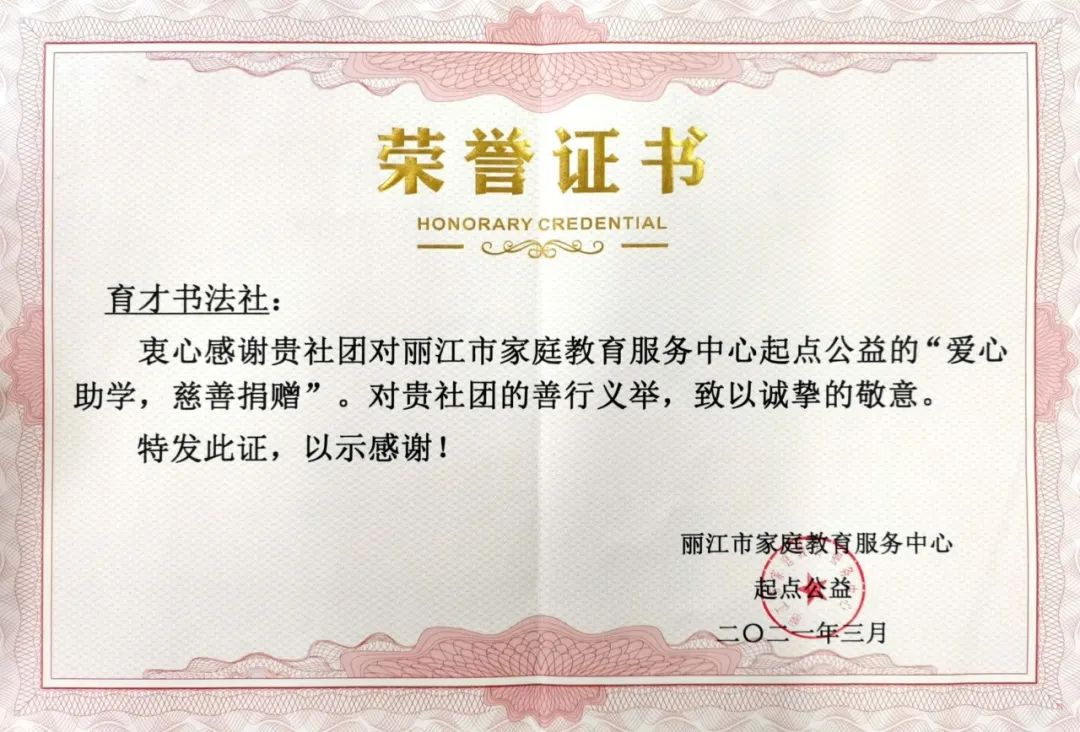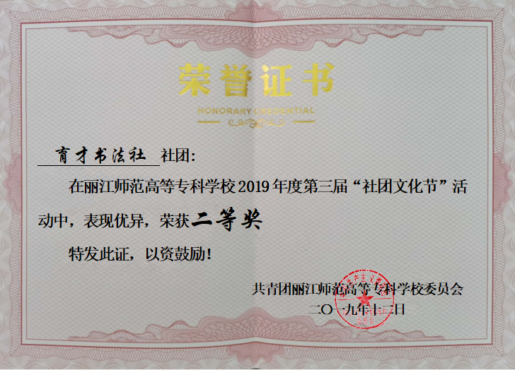 在2021年10月,国家民委进校园,实地考察丽江市申报国家级民族团结进步示范市,主动召集社员参与了“丽江师范高等专科学校第二届中华文化系列节目展演”相关表演活动,并以书法作品的形式献礼民族大团结,以实际行动和优异的成绩迎接党的二十大胜利召开。